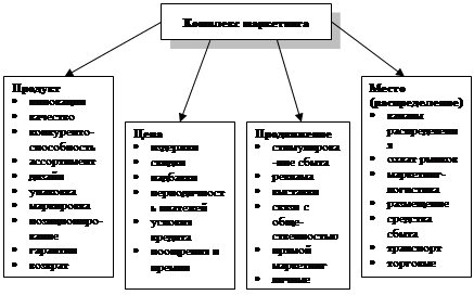 Рис. 3. Составляющие комплекса маркетинга Существенным элементом комплекса маркетинга является цена. Цены, устанавливаемые на продукт, должны быть такими, чтобы обеспечить поступление достаточных доходов, покрывающих издержки производства, распределения и реализации и приносящих прибыль. И в то же время цена должна быть доступной и привлекательной для покупателя. Если цена не соответствует ценности продукта, потребители обратятся к товарам конкурентов. Перед специалистами маркетинга в области цен стоят задачи анализа факторов, которые оказывают влияние на цены. Работа по анализу рыночных возможностей, отбору целевых рынков, разработке комплекса маркетинга и, тем более, его реализация требуют серьезных дополнительных усилий по управлению маркетингом. В частности, предприятие должно иметь системы маркетинговой информации, планирования маркетинга, службы маркетинга и маркетингового контроля. Все вышеперечисленные слагаемые комплекса маркетинга так или иначе зависят не только от самого предприятия (его усилий), но и от тенденций и событий, имеющих место в маркетинговой среде, учет которых необходим при разработке комплексов маркетинга. Однако, следует отметить, что на многих предприятиях России маркетинг применяется недостаточно широко и эффективно. Это в частности связано с отсутствием опыта применения маркетинга, небольшими размерами предприятий и сферы маркетинговой деятельности, дефицитом квалифицированных маркетологов и компьютерного обеспечения. Заключение Таким образом, в настоящей работе были изучены основы и особенности менеджмента и маркетинга. На основании изложенного можно сделать ряд обобщающих выводов: 1) Суть менеджмента состоит в совокупности принципов, форм и методов управления производством и персоналом, в рациональном и эффективном применении ресурсов предприятия. 2) Понятие «экономическая эффективность управленческого труда» представляет собой экономию живого и овеществленного труда, получаемую в сфере управления материальным производством в результате оптимизации и рационализации управленческой деятельности. 3) Чем меньше показатель эффективности системы управления, тем выше экономичность системы управления, так как чем ниже уровень затрат на управление и выше производительность труда, тем рациональнее и экономичнее производство. 4) Маркетинг — это работа с рынком ради осуществления обменов, цель которых — удовлетворение человеческих нужд и потребностей. 5) Основным принципом маркетинга является ориентация конечных результатов производства на реальные требования и пожелания потребителей. 6) Основные положения теории и практики маркетинга могут быть использованы любыми товаропроизводителями и видами предприятий. 7) В маркетинге объединяются основные понятия экономической теории: товар, спрос, предложение, цена, конкуренция. 8) На многих предприятиях маркетинг применяется недостаточно широко и эффективно. Это в частности связано с отсутствием опыта применения маркетинга, небольшими размерами предприятий и сферы маркетинговой деятельности, дефицитом квалифицированных маркетологов и компьютерного обеспечения. Список использованной литературы 1. Анн Х, Багиев Г.Л., Тарасевич В.М. Маркетинг: Учебник. – СПб.: Питер, 2005. – 736 с. 2. Барышев А.Ф. Маркетинг: Учебник. – М.: Издатель