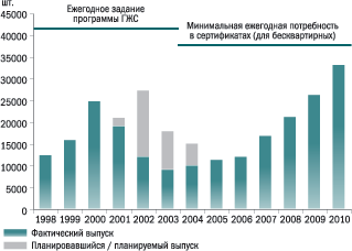 Рисунок 5. Количество государственных жилищных сертификатов, выпущенных в рамках Программы в 1998-2003 гг. и планируемый выпуск сертификатов в рамках подпрограммы "Государственные жилищные сертификаты" на 2004-2010 гг. Рисунок 6. Финансирование ФЦП "Государственные жилищные сертификаты" в 1998-2003 гг. и планируемое финансирование подпрограммы "Государственные жилищные сертификаты" на 2004-10 гг. Таблица 4 – Программы ипотечного кредитования Сбербанка