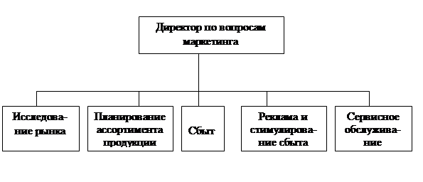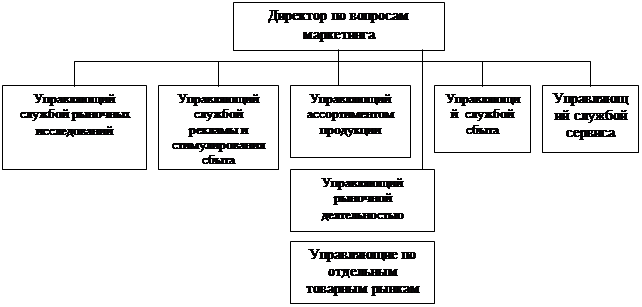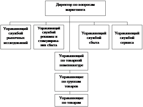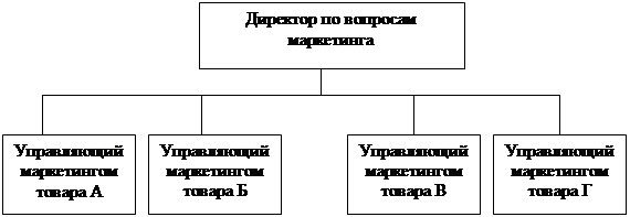Кроме указанных подразделений, в службе маркетинга могут быть созданы отделы: планирования маркетинга, управления товародвижением, новых товаров. Функциональная организация маркетинга базируется на разделении труда по установившимся и вновь возникающим функциям, на специализации работников. При небольшой номенклатуре выпускаемой продукции функциональная организация маркетинга обладает высокой маневренностью благодаря простоте управления. Но при расширении номенклатуры выпускаемой продукции производственная маневренность снижается, поскольку возрастает период реакции на изменение внешних условий. Функциональную структуру маркетинга характеризует слабая гибкость стратегии, так как она ориентирует на достижение текущего эффекта, а не на внедрение нововведений. Подобная структура маркетинговой деятельности не способствует динамизму и новаторству. В целом же такая структура является эффективной формой организации только при устойчивом производстве ограниченного ассортимента изделий. Функциональная маркетинговая структура выступает базовой для остальных форм. Для предприятий, выпускающих большое количество разнообразной продукции, требующей специфических условий производства и сбыта, целесообразна организация маркетинга по товарному принципу (рис.2 ).