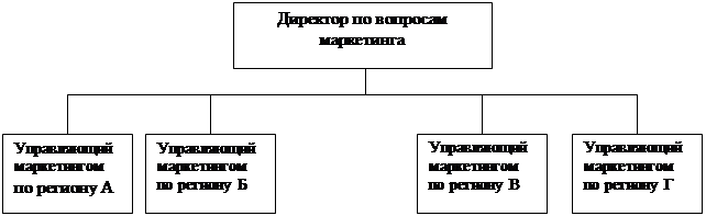 Рис. 3. Организационная структура службы маркетинга с ориентацией по рынкам и покупателям Рынком может выступать отрасль промышленности либо сегмент однородных покупателей. Основные рынки закрепляются за управляющими по рынкам, последние сотрудничают со специалистами функциональных подразделений в разработке планов по различным направлениям функциональной деятельности. Для каждого рынка должна быть выработана своя стратегия маркетинга. На предприятиях, выпускающих продукцию, покупаемую многими регионами, в каждом из которых целесообразно учитывать специфику потребления этой продукции, маркетинговые структуры могут быть организованы по регионам (рис.4 ). При организации маркетинга по региональному принципу торговые агенты могут жить в пределах обслуживаемой территории и работать с минимальными издержками времени и средств на разъезды. Такая маркетинговая структура встречается в крупных децентрализованных фирмах (особенно международных) с обширными рынками, которые иногда разграничиваются на отдельные зоны и районы. Недостатком подобной маркетинговой структуры, так же как и структур, ориентированных на товары и рынки, является дублирование работ, а также проблемы координации деятельности.
