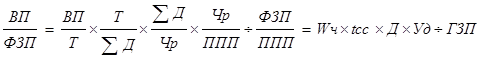 или изменение среднечасовой выработки за счет i-го фактора умножить на фактическую величину продолжительности рабочего дня, количества отработанных дней одним рабочим за год, удельного веса рабочих в общей численности работников и среднесписочной численности работников предприятия: