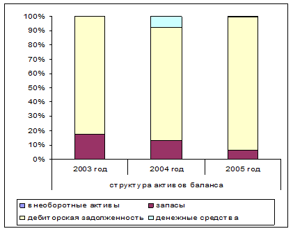 На рассматриваемом предприятии валюта баланса за 2004 год увеличилась на 33,2%, а за 2005 год на 73,3%. Рассмотрим более подробно изменения, которые произошли в значениях статей баланса. АКТИВ: Величина внеоборотных активов уменьшилась в 2004 г. на 12,9%, в 2005г. на 18,1% за счет уменьшения основных средств. Количество оборотных активов увеличилось в 2004г. на 33,3%, а в 2005г. – на 73,3%. Рассмотрим, за счет чего увеличился объем оборотных активов в 2004 году. Мы видим, что стоимость запасов практически не изменилась (сократились издержки обращения, но увеличились товары для перепродажи), увеличилась почти на 30% дебиторская задолженность и значительно увеличились денежные средства. В 2005 году картина меняется. Почти на 20% уменьшаются запасы (как за счет издержек, так и за счет товаров), значительно сокращаются денежные средства, но практически в 2 раза возрастает дебиторская задолженность. ПАССИВ: В 2004 и в 2005 годах увеличение пассива происходит как за счет роста собственного, так и за счет роста заемного капитала. Но в 2004 году темп роста собственного капитала значительно выше. Мы видим, что рост собственного капитала происходит за счет увеличения нераспределенной прибыли. Рост заемного капитала в 2004 году происходит за счет краткосрочной кредиторской задолженности (большую часть которой составляет задолженность поставщиков и подрядчиков), а краткосрочные займы и кредиты – сокращаются. В 2005 году растут и займы и кредиторская задолженность, причем темп роста займов и кредитов выше кредиторской задолженности. Вертикальный анализ показывает структуру средств предприятия и их источники. Он применяется к исходному балансу, к трансформированному, либо к модифицированному (укрупненному по статьям). При проведении вертикального анализа расчет ведется в условных единицах, то есть Итог баланса на начало (на конец) года принимается за 100 ед. и все статьи Актива (Пассива) пересчитывается с учетом доли процентов в общей сумме. Вертикальный анализ позволяет не учитывать инфляцию, а анализировать лишь структуру баланса. Вертикальный анализ бухгалтерского баланса представлен в таблице 2.2 Таблица 2.2