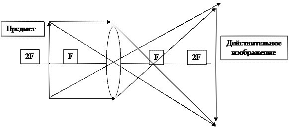 Между прочим, для рассеивающей линзы расстояния fи bследует считать отрицательными: Построение изображений предмета в линзах осуществляется с помощью следующих лучей: - проходящего через оптический центр линзы и не изменяющего своего направления; - идущего параллельно главной оптической оси, который после преломления в линзе проходит через второй фокус; - луча (или его продолжения), проходящего через первый фокус линзы, который после преломления выходит параллельно её главной оптической оси. Примеры построений изображения : 1) Действительное изображение в собирающей линзе