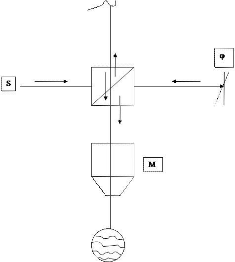 Рис.6. Схема интерферометра Майкельсона Монохроматический свет падает на полупрозрачное зеркало Ms . Половина интенсивности светового пучка направляется к неподвижному зеркалу M2 и отражается обратно. Другая половина интенсивности отражается от зеркала Ms , падает на подвижное зеркало M1 (которое может перемещаться вверх-вниз) и отражается от него. Отражённый пучок 1 проходит через Ms и попадает в глаз наблюдателя. Часть пучка 2 отражается от зеркала Ms и также попадает в глаз наблюдателя. Обычно на пути пучка 2 помещают компенсатор C в виде пластины из прозрачного стекла (его изготавливают из той же стеклянной пластины, что и зеркало Ms ), чтобы оба пучка проходили с точностью до долей длины волны слой стекла одинаковой толщины. Если оба пути одинаковы, то будет происходить усиление интенсивности света, и наблюдатель увидит свет. Если же подвижное зеркало M1 отодвинуть на расстояние l /4 , то пучок 1 будет проходить дополнительное расстояние, равное l /2 (расстояние l/4 он пройдёт туда и обратно), и будет происходить ослабление интенсивности - в этом случае наблюдатель увидит темноту. Если зеркало M1 продолжать перемещать в том же направлении, то вновь появится свет, потом темнота и т.д. Интерферометр Майкельсона позволяет проводить очень точные измерения длин волн. Действительно, при перемещении зеркала M1 всего лишь на l /4 происходит ясно различимый переход от освещённости к затемнению. Для l = 400 нм это соответствует точности в 100 нм, или 0.1 мкм. Ещё большей точности можно достичь, наблюдая чередование полос в случае непараллельных зеркал. 2. Микроинтерферометр Линника Для контроля за чистотой обработки металлических поверхностей высокого класса В.П. Линник разработал микроинтерферометр, представляющий комбинацию интерферометра Майкельсона и микроскопа. Свет от источника S падает на разделяющий кубик, склеенный из двух призмочек. Гипотенузная грань одной из призмочек посеребрена так, что частично пропускает, а частично отражает падающие на неё лучи света. Прошедший пучок попадает на зеркало Z , отражается обратно к кубику и, отразившись от полупрозрачной грани, идёт в микроскоп M. Второй луч, отразившись от полупрозрачной грани, падает на исследуемую поверхность и, отразившись от последней, проходит через кубик в микроскоп M, интерферируя с первым лучом. Зеркало Z наклонено под небольшим углом относительно грани кубика так, что разность хода обоих лучей вдоль поля зрения микроскопа линейно возрастает. Благодаря этому при идеальной гладкости испытуемой поверхности в поле зрения микроскопа будут видны светлые и тёмные интерференционные полосы равной толщины. Если же на испытуемой поверхности есть неровности, то в этих местах изменяется ход второго луча и интерференционные полосы соответственно сдвигаются, как показано на рисунке. Данный метод позволяет оценить чистоту обработки поверхности с точностью до 0.1 l или ~0.05 мкм.