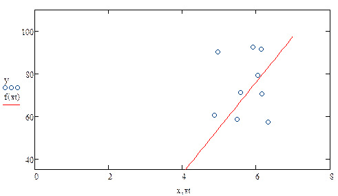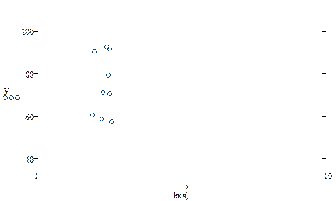 Рисунок 4 – Распределение точек С помощью программы Mathcadподберем функцию, максимально близко проходящую к данным точкам, либо проходящую через них. Т.е. определим функциональную зависимость yот х. Для этого воспользуемся методом перебора возможных вариантов: сначала оценим погрешность аппроксимации линейной, степенной и логарифмической функций. Оптимальной будем считать ту аппроксимирующую функцию, которая позволяет достичь минимального среднеквадратического отклонения Рассмотрим линейную функцию Для того, чтобы провести график данной функции и оценить погрешность аппроксимации, необходимо найти коэффициенты aи b. Воспользуемся встроенными