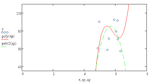 Результаты аппроксимации данных полученными полиномами polyи poly2 представлены на рис. 6