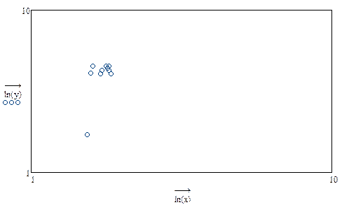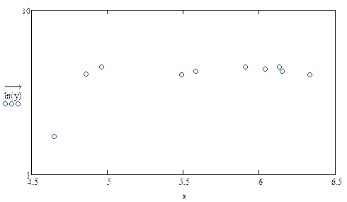 Рисунок 9 – Логарифмические шкалы по обеим осям Можно заметить что на рисунке 7 точки приближенно укладываются в прямую линию. Это означает что подбираемую функцию можно линеаризовать, если заменить вектор у на ln(у). В уравнении ln(у) = а*х + ln(b) заменим ln(у) на у1, а заменим на а0, ln(b) y на b0. Применили линейную аппроксимацию для расчета коэффициентов а и ln(b), а затем А и В. Получим у = В*еАх