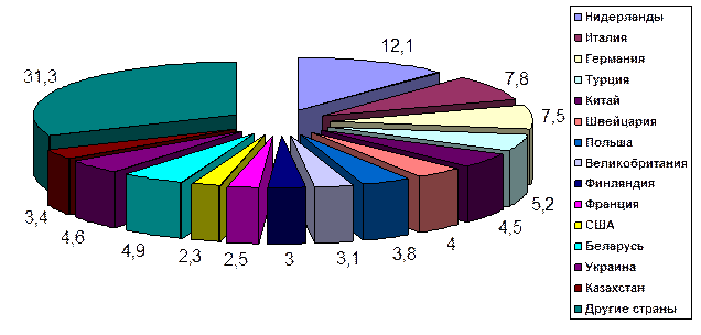 Рисунок 3- Географическая структура экспорта РФ по странам в 2007 году общем объеме экспорта России в январе-октябре 2008 года увеличилась с 84,7% (2007 год) до 84,9%. Основным экономическим партнером страны фактически является Европейский Союз. Если в 1995 году экспорт в страны ЕС составил 38 млрд. долл., то в 2007 году эта цифра составила 184,73[21] млрд. долл., что в 4,9 раза больше. Также хорошо торговые связи налажены со странами Азии, экспорт в которые в 2007 году составил 45,82 млрд. долл. Экспорт в Северную Америку в 2007 году составил 19,87 млрд. долл., причем 91,6 % от этого объема есть экспорт в США. Экспорт же в Центральную и Южную Америку составил 4 млрд. долл., что на 15% меньше чем в 2005 году. Импорт товаров (по методологии платежного баланса), в январе-октябре 2008 года составил 246,1 млрд. долл. и увеличился по сравнению с соответствующим периодом прошлого года на 39,7% (в январе-октябре прошлого года — на 37%). Начиная с августа, отмечается замедление темпов роста импорта в долларовом выражении (среднемесячный темп прироста- 0,5% против 4,3% в первом квартале и 2,0% - во втором). В 2007 году в импорте преобладали поставки из Германии - 13,3%, Китая - 12,2, Японии- 6,4, США- 4,7, Италии- 4,3, Франции- 3,9, Соединенного Королевства (Великобритании)- 2,8, Финляндии- 2,5, Польши- 2,3, Нидерландов - 1,9%. Что касается стран СНГ, то лидерами являются Украина- 6,7% от всего объема российского импорта, Беларусь- 4,4%, Казахстан- 2,3% Географию импорта можно увидеть на Рисунке 4.