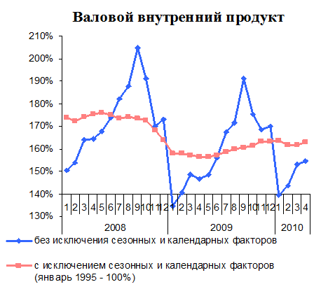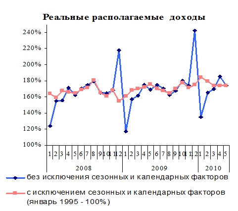 В мае текущего года, по оценке Минэкономразвития России, рост ВВП продолжился и составил с исключением сезонности 0,4% по сравнению с апрелем. Положительный вклад в рост ВВП внесли промышленное производство и торговля. Отрицательной динамикой характеризуется строительство. По сравнению с маем прошлого года, по оценке Минэкономразвития России, ВВП увеличился на 5,8% и за январь-май рост составил 4% к соответствующему периоду прошлого года. Реальные располагаемые доходы населения после возобновившегося роста в апреле в мае снизились с исключением сезонности на 0,1 процента. По отношению к маю прошлого года рост составил 2,8 процента.