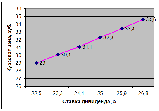 На рисунке 2 мы можем увидеть изменение курсовой стоимости акций в зависимости от изменения ставки банковского процента. По графику видно, что зависимость между этими показателями обратно пропорциональная, то есть при увеличении ставки банковского процента курсовая цена снижается. Доходность акции определяется не только получением части распределенной прибыли АО в виде дивиденда, но и возможность продать бумагу на вторичном рынке по цене, большей цены приобретения. Дополнительный доход при росте курса акции или убыток при падении курса можно определить по формуле (16):