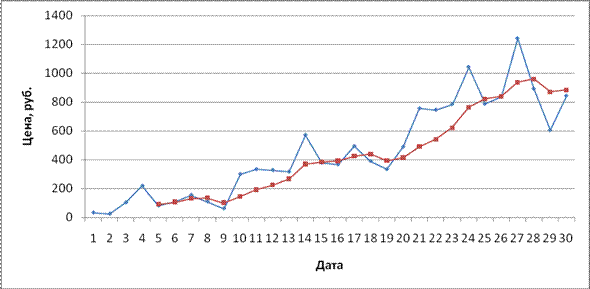 где X – скользящая средняя; Xi – цена бумаги на i-ый день; i – день, на который рассматривается; N – число дней, за которые берутся текущие цены. Если линия текущих цен выше линии средних цен, рынок повышательный. Если текущие цены два дня подряд ниже средних, ожидается понижательный рынок. При пересечении линии текущих цен с линией средних цен последует изменение тенденции рынка: при повышательном рынке делается вывод о последующем снижении цен, а при понижательном — о росте цен. В таблице 7 представлены изменения курсовой цены акции в течение апреля 2010 года. Для этого высчитаем курсовую стоимость акции на апрель 2010 года: