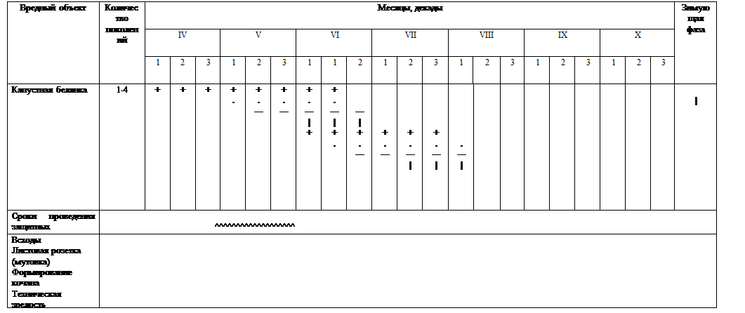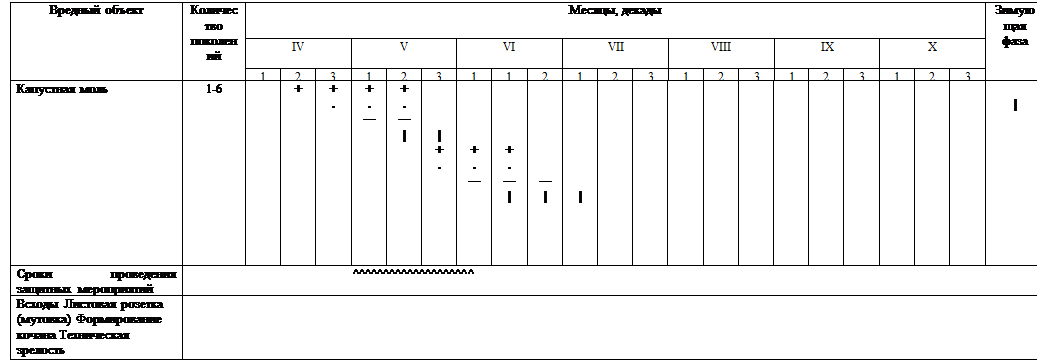 Как видно из таблицы, приведенной выше, кила капусты поражает растение в период листовой розетки — формирование кочана; черная ножка поражает растение в период всходов и листовой розетки; ложная мучнистая роса поражает растение в фазы формирования кочана и его технической спелости; альтернариоз поражает растение в период формирования кочана. Поэтому при массовом проявлении болезней необходимо провести защитные мероприятия в указанныесроки. 3. Обоснование системы защитных мероприятий от вредителей и болезней капусты Таблица 7. Система мероприятий по защите капусты от вредителей и болезней.