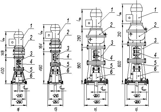 Рисунок П1 - Приводы вертикальные: 1 - электродвигатель, 2 - редуктор (рис. а - типоразмер МРВ 02, рис. б - типоразмер МРВ 04, рис. в - типоразмер МП01-05, рис. г - типоразмер МП01-10), 3 - стойка вертикальная (рис. а - масса стойки 56кг, рис. б - масса стойки 68кг, рис. в - масса стойки 75кг, рис. г - масса стойки 86кг) в комплекте со стойкой поставляются: 4 - муфта продольно - разъемная по диаметру выходного вала привода, 5 - подшипниковый узел, 6 - уплотнение сальниковое. Приложение Р Лапы опорные подвесных аппаратов