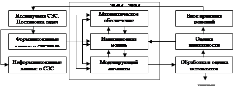 можно заранее сформулировать поведение системы в будущем. Марковские случайные процессы называют Марковскими цепями с вероятностью перехода в pij , когда процесс изучается в дискретные моменты времени. 5.2. Имитационное моделирование систем и процессов. Применяется в случаях, когда нельзя заформализовать модель (описать аналитическим выражением) и в случае, когда система представляет собой многопараметрическую вероятностную экономическую систему. Кроме того, моделирование с помощью имитационных подходов применяется для систем больших размерностей и с большими внутренними связями. Основные этапы моделирования: 1) анализ моделируемой систем, сбор необходимой информации, выделение проблемной области исследования и постановка задач на исследование; 2) синтезирование (формирование, получение) необходимой математической модели области допустимых упрощений (ограничений), выбор критериев оценки эффективности и точности моделирования; 3) разработка имитационной модели, алгоритма ее реализации, внутреннее и внешнее математическое обеспечение; 4) оценка адекватности имитационной модели и контроль результатов экстремумов с последующей валидацией модели; 5) анализ результатов моделирования с целью достижения заданной точности моделирования. 5.3. Имитационная модель и ее структура..