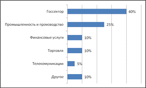 Рис.2.2.1. Структура оборота по сферам деятельности клиентов в 2009 г.,% Особенностью республики является деление на две условные экономические зоны: казанскую и закамскую. Основные предприятия, в том числе КАМАЗ, нефтяные компании, химические заводы (примерно 70% промышленного потенциала Татарстана) расположены в Закамье. Тогда как в столице сосредоточены государственные учреждения, вузы, научно–исследовательские институты, транспортные компании и крупные машиностроительные предприятия. В целом обороты экономических зон примерно одинаковые. Но в отдельно взятых нишах это равенство нарушается. Так, IT– фирмы, работающие с крупными корпоративными заказчиками, большую часть доходов получают в Закамье, а обороты компаний, клиентами которых являются бюджетные организации, формируются, главным образом, в Казани. По мнению экспертов, на долю казанского рынка приходится 60% бизнеса, на долю закамского – 40%. Самым интересным участком IT рынка является нефтяная столица Татарстана Альметьевск, денежный оборот Альметьевска несколько превосходит оборот Казани [28]. Спрос на IT услуги в Татарстане наиболее заметен в активно растущих и реорганизуемых отраслях, таких как нефтегазовый сектор, электроэнергетика, машиностроение, металлургия, телекоммуникации, а также государственный, финансовый и промышленный сектор [29]. Сегодня в республике зарегистрировано несколько сотен компьютерных фирм. Около 80 компаний находится в Казани, примерно 50 из них хорошо известны в городе благодаря активной рекламной политике, 20 фирм работает в Набережных Челнах, чуть меньше в других промышленных городах – Альметьевске, Елабуге, Зеленодольске, Нижнекамске, Чистополе. В общее число IT –компаний Татарстана входят и так называемые «карманные» фирмы, созданные при крупных предприятиях и работающие только в их интересах. Рядом с крупными местными компаниями соседствуют карликовые фирмы, которые занимаются отверточной сборкой и довольствуются небольшими объемами продаж. Если их брать в расчет, то в Казани можно насчитать полторы сотни компаний. Количество мелких игроков неуклонно растет. Как отмечают эксперты, местные фирмы многопрофильны, ярко выраженной специализации нет. Некоторые компаний с разным успехом пытаются работать только в области системной интеграции, есть считанные игроки, которые избрали своей нишей поставку законченных решений [29]. Сегодня на IT – рынке РТ лидирует 10–15 компаний, вместе они контролируют 80–85% всего оборота. В их числе «Абак», «Центр», «ТатАИСэнерго», «МЭЛТ», «АйТи», «Линт», «Форт Диалог», РБС, ICL КПО ВС, Logic Systems и др. Несмотря на многопрофильность компаний, каждый игрок имеет свою фокусную нишу. Так, компании ICL–КПО ВС лучше других удается работать с государственными структурами, у компании «Форт Диалог» сильны позиции в Закамье, компания делает акцент на разработке и внедрении КИС (корпоративные информационные системы), лидируя в этой области по объему работ и по числу проектов. «Линт» имеет репутацию опытного системного интегратора, на розничном рынке Казани лидирует «МЭЛТ», заметны усилия ООО «Центр» и «Абак». В июне 2010 г. журналом «Деловой квартал» (№ 6) был проведен рейтинг IT компаний на рынке Татарстана (табл. 2.2.1.). Из таблицы видно, что по обороту от системной интеграции компании «Форт Диалог» находится на втором месте по