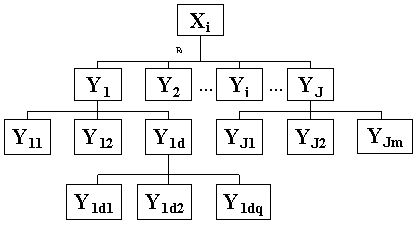 Рис. 4. Построение дерева качества специалиста: Хi – качество i-го специалиста, i = 1,2,…,I, где I – количество специалистов; Yj – выбранные критерии, j = 1,2,…,J, где J – количество критериев; Yjp – признаки критериев, j = 1,2,…,J, где J – количество критериев, p=1,2,…,d (m) — количество признаков у данного критерия; Yjpq — уровни оценок признаков, q = 1,2,…, Q, где Q — количество уровней оценок; Rj , rp – весовые коэффициенты. В результате решения по данной модели определяется сумма баллов конкретного сотрудника ООО «Стройкомплект», которая соответствует сумме баллов, определенных уровнем оценок признаков, взятых из оценочной шкалы. Причем эта величина будет стремиться (ограничена сверху) к общей сумме баллов, которые может набрать «идеальный» сотрудник. Для удобства расчетов эта величина определяется в 1000 баллов: