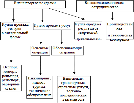 Рис. 1.1. Формы внешнеэкономических связей Разнообразие форм внешнеэкономической деятельности может быть показано на примерах сотрудничества в разных областях ВЭД. 1. Во второй половине ХХ века важную роль приобрело военно-техническое сотрудничество (ВТС) с иностранными государствами. В Федеральном законе № 114-ФЗ «О военно-техническом сотрудничестве РФ с иностранными государствами» ВТС определено как «деятельность в области международных отношений, связанная с выводом и вводом, в том числе с поставкой или закупкой продукции военного назначения, а также с разработкой и производством продукции военного назначения». 2. В областях научно-технического и научно-производственного сотрудничества с зарубежными партнерами следует отметить создание совместных предприятий, выполнение НИОКР, проведение разнообразных исследований и разработок, предоставление высокотехнологичных услуг (включая космические услуги по выведению на орбиту спутников с высокоточной аппаратурой, создание новых материалов в условиях невесомости), торговлю лицензиями, патентование изобретений, регистрацию товарных знаков. 3. Сотрудничество в строительной области включает в себя проектные разработки и строительство объектов за рубежом при содействии российских организаций и на территории нашей страны с участием иностранных фирм. Эта форма часто предусматривает в себе также подготовку национальных кадров для построенных объектов, обеспечение технологической и эксплуатационной информацией и последующее содействие в их эксплуатации. 4. В последнее время все большую актуальность приобретает инвестиционное сотрудничество с иностранными партнерами – привлечение иностранных инвестиций (капиталовложение в российскую экономику). С этим тесно связано сотрудничество в валютно-финансовой и кредитной сферах, включающее получение и предоставление кредитов, финансирование различных проектов, осуществление платежно-расчетных операций и страховых операций. 5. Сотрудничество в области транспорта и информатики – это международные перевозки экспортных и импортных грузов, транзитные перевозки иностранных грузов, транспортно-экспедиторское обслуживание, сотрудничество в области связи и информатики с использованием современных электронных средств, СМИ, включая ТВ, радиовещание, газетно-журнальную и документально-кинематографическую продукцию. 6. Самостоятельным видом ВЭД можно считать издательско-полиграфическую деятельность , осуществляемую совместно с иностранными партнерами, в том числе написание совместных трудов исторического, философского, экономического, социологического и иного профиля, общеобразовательных и популярных книг, издание книг российских авторов в зарубежных издательствах и иностранных авторов в России. 7. В связи с бурным развитием мирового рынка туристических услуг как самостоятельную форму можно выделить сотрудничество в содействии иностранного туризма , в котором четко прослеживаются три направления: научное , деловое и развлекательное . Основу туризма составляют фирмы по организации туристических поездок и продаж путевок и туров, а также фирмы, организующие передвижение туристов, обеспечивающие их жильем, информацией и другими услугами. С туризмом также тесно связан экспорт услуг при проведении различных культ