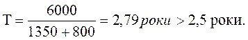 де Т – строк окупності інвестиційного проекту, роки; К – витрати на реалізацію даного інвестиційного проекту, грн.; Дч – чистий дохід від впровадження даного проекту, грн.; Дч = ЧП – А, де ЧП – чистий прибуток, грн.; де А – сума амортизаційних відрахувань на рік реалізації інвестиційного проекту, грн.; Чистий прибуток визначимо за формулою: ЧП = П*(1-Н), П – щорічний прибуток, що отримується від використання обладнання, грн.; Н = 25% - ставка податку на прибуток за чинним законодавством. Тоді, ЧП = 1800 * (1-0,25) = 1350 грн. Тв.в. – економічно виправданий строк окупності інвестицій, який приймає керівництво, роки. Отже,