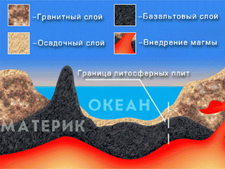 После «гранитного» слоя, находится слой, сложенный преимущественно из базальта — горной породы глубинного происхождения. Базальт тяжелее гранита, он содержит больше железа, магния и кальция. Эти три слоя земной коры — осадочный, «гранитный» и «базальтовый» — хранят все полезные ископаемые, используемые человеком. Толщина земной коры не везде одинакова: от 5 км под океанами до 75 км под материками. Под океанами, как правило, отсутствует «гранитный» слой. За земной корой, если двигаться к центру Земли следует, самый толстый слой Земли – мантия (учёные говорят «самый мощный»). Никто никогда не видел ее. Ученые предполагают, что состоит она из магния, железа и свинца. Температура здесь около +2000° С! От низлежащей мантии земную кору отделяет во вмогом еще загадочный Слой Мохо (назван так в честь сербского сейсмолога Мохоровичича, открывшего его в 1909 году), в котором скорость распространения сейсмических волн скачкообразно увеличивается. На долю Мантии приходится около 67% общей массы планеты. Твердый слой верхней мантии, распространяющийся до различных глубин под океанами и континентами, совместно с земной корой называют литосферой - самой жесткой оболочкой Земли. Под ней отмечен слой, где наблюдается некоторое уменьшение скорости распространения сейсмических волн, что говорит о своеобразном состоянии вещества. Этот слой, менее вязкий и более пластичный по отношению к выше и ниже лежащим слоям, называют астеносферой. Считается, что вещество мантии находится в непрерывном движении, и высказывается предположение, что в относительно глубоких слоях мантии с ростом температуры и давления происходит переход вещества в более плотные модификации. Такой переход подтверждается и экспериментальными исследованиями. В нижней мантии на глубине 2900 км отмечается резкий скачок не только в скорости продольных волн, но и в плотности, а поперечные волны сдесь исчезают совсем, что указывает на смену вещественного состава пород. Это внешняя граница ядра Земли. Ученые установили, что температура горных пород с глубиной возрастает: в среднем на каждые 30 м глубины Земли становится теплее на 1 С. Мантия получает огромное количество тепла от ядра Земли, которое ещё горячее. При огромной температуре породы мантии должны быть в жидком, расплавленном виде. Но этого не происходит, потому что вышележащие горные породы давят на мантию, и давление на такой глубине в 13 тысяч раз больше, чем на поверхности. Иначе говоря, на каждый 1 см2 горной породы давят 13т. Столько весит КАМАЗ, груженый асфальтом. Поэтому, по-видимому, породы мантии и ядра находятся в твердом состоянии. Выделяют нижнюю и верхнюю мантию. Состав мантии: Люди давно заметили, что на дне глубоких шахт температура горных пород выше, чем на поверхности. Некоторые шахты даже приходилось забрасывать, потому что там становилось невозможно работать, так как температура достигала +50° С. Ядро Земли — пока загадка для науки. С определенной достоверностью можно говорить лишь о его радиусе — примерно 3500 км и температуре — около 4000 °С. Это пока все, что известно науке о строении глубин Земли. Некоторые учёные придерживаются мнения о том, что наше ядро состоит из железа, другие допускают возможным существования огромной пустоты в центре нашей планеты. Выделяют внешнее и внутреннее ядро. Но каково ядро Земли на 
