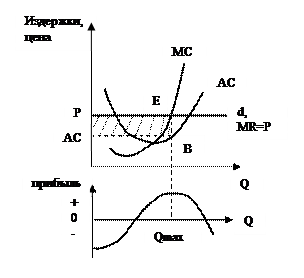 Рисунок 4.5.1.Долгосрочное конкурентно равновесие Вопросы для самоконтроля: 1. Что выражает кривая изокванта и ее кривизна? 2. Назовите особенности краткосрочной функции производства? 3. Перечислите постоянные и переменные факторы производства? 4. Чему равен предельный продукт труда, когда совокупный продукт достигает максимума? 5. Когда предельный продукт труда превышает средний продукт труда то, что происходит среднем продуктом? 6. Почему кривые AC и AVC по мере увеличения выпуска сближаются? 7. Почему кривая предельных издержек пересекает кривых AC и AVC в их минимальной точке? 8. Каким образом закон убывания предельной производительности влияет на кривизну кривой переменных издержек ? 9. Когда предельный продукт труда меньше среднего продукта труда то, что происходит среднем продуктом? 10. Что выражает линия изокоста и как определяется наклон линии изокосты? 11. Укажите условие определения минимальных затрат производства данного объема продукции ? 12. Почему кривые совокупных средних и средних переменных издержек имеют U – образную форму, в то время как кривая средних постоянных издержек всегда имеет наклон вниз? Основная литература 1. Долан Э., Линдсей Д. Рынок: микроэкономическая модель / Пер. с англ. В.Лукашевича и др.; Под общ. ред. Б.Лисовика и В. Лукашевича. - М., 1996. 2. Кулекеев Ж.А.,Султанбекова Г.К. Микроэкономика: Учебное пособие для ВУЗов, 2-е издание. – Алматы, РГП «Казстатинфром», 2001. 3. Нуреев Р. М. Курс микроэкономики: учебник для ВУЗов - М: НОРМА – ИНФРА, 2000. 4. Пиндайк Р., Рубенфельд Д., Микроэкономика.- М.,1992. 5. Хайман Д.Н. Современная микроэкономика: анализ и применение. В 2-х т.Т.1. – М., Финансы и статистика,1992. Дополнительная литература 1. Гальперин В.М., Моргунов В.И., Игнатьев С.М. Микроэкономика. Изд.2-е, С-Пб., 1996. 2. Гребенников П.И, Леусский А.И., Тарасевич Л.С. Микроэкономика. Изд.2-е, С-Пб., 1996. 3. Емцов Р.Г., Лукин М.Ю. Микроэкономика.М.1997. 4. Курс экономической теории: Общие основы экономической теории. Микроэкономика. Макроэкономика. Основы национальной экономики.: Учебное пособие / Под ред. д.э.н., проф. А.В.Сидоровича; МГУ им. М.В.Ломоносова - М., Изд., «Дело и Сервис», 2001 5. Маршалл А. Принципы политической экономии. М..:Прогресс,1976. 6. Максимова Б.Ф. Микроэкономика. М.: СОМИНТЭ, 1996. 7. Макконел К.Р., Брю С., Экономикс, в 2-х томах, 2 том. М.: Республика, 1992 8. Микроэкономика / Под ред. Е.Б. Яковлевой – АКАЛИС, 1997. 9. Микро-, макроэкономика. Практикум / Под общ. ред. Ю.А.Огибина, С-Пб., 1994 10. Овчинников Г.П. Микроэкономика. Макроэкономика. – С-Пб. Изд. Михайлова В.А., 1997. 11. Пол Хейне. Экономический образ мышления. М.: 1992 12. Робинсон Дж. Экономическая теория несовершенной конкуренции:Пер.с англ.- М.: Прогресс,1986. 13. Самуэльсон П. Экономика. Т1,2.-М.: Финансы и статистика,1992. 14. Фишер С., Дорнбуш Р., Шмалензи Р. Экономика.- М., 1993 15. Хэл Р.Вэриан. Микроэкономика. Промежуточный уровень. Современный подход. М., ЮНИТИ 1997. 16. Чемберлин Х. Теория монополистической конкуренции.- М.: Изд-во иностр.лит., 1959. РАЗДЕЛ 3. РЫНОК СОВЕРШЕННОЙ КОНКУРЕНЦИИ Тема 5. Максимизация прибыли и конкурентное предложение Вопросы лекции: 1. Рынок совершенной конкуренции и его характеристика. 2. Максимизация прибыли конкурентной фирмы в краткосрочном периоде. 3. Кривые предложения конкурентной фирмы в краткосрочном периоде. 1-вопрос. Модель рынка совершенной конкуренции имеет важное значение для анализа многих рынков, таких как рын