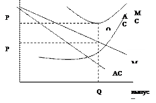 Рисунок 7.2.2. Убытки фирмы монополистического конкурента Как видно из графика, сложилась менее благоприятная ситуация с издержками и спросом, ставящая фирму в положение, при котором она несет убытки в краткосрочном периоде (прямоугольник Р1Р2 О В). Такая ситуация возможна, когда конкуренция обостряется, и благодаря легкому доступу на рынок в соперничество включаются новые фирмы. По мере расширения ими новых услуг фирма будет терять свою долю реализации на рынке, и ее кривая спроса сместиться вниз. Фирма будет поставлять услуги до тех пор, пока ее экономическая прибыль станет равной нулю. 3-вопрос. В долговременном периоде, однако, существует тенденция к получению нормальной прибыли, или к безубыточности фирм, действующих в условиях монополистической конкуренции. В случае получения прибылей в краткосрочном периоде можно ожидать, что экономические выгоды привлекут новых конкурентов, поскольку вступление на рынок является относительно простым. Когда большинство фирм столкнется с убытками в краткосрочном периоде, произойдет массовый выход фирм из отрасли в долговременном периоде. Оставшиеся фирмы обнаружат, что их убытки постепенно уступают место почти нормальным прибылям. В долгосрочном плане колебания краткосрочного периода выравниваются и устанавливаются равновесие в случае, когда кривая спроса является касательной к кривой средних издержек (рис. 7.3.1).