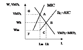 Как показано на графике рис.8.3.1. кривая AIC является кривой SL . AIC равна заработной плате, которая должна быть выплачена для привлечения любого заданного числа работников. Предельные издержки на рабочую силу (MIC) для любого заданного числа рабочих дней получается графически путем прибавления прироста издержек на рабочую силу, нанятую ранее, к заработной плате, которую необходимо платить дополнительному работнику, если фирма-монопсонист хочет увеличить рабочую силу на одну единицу (L1 +1). MIC > AIC, так как фирма должна увеличить заработную плату для привлечения новых работников. Теперь при помощи графика в рис.8.3.1. рассмотрим, как фирма- монопсонист принимает решение о найме рабочей силы в целях максимизации прибыли. Фирма –монопсонист нанимает рабочую силу до точки, в которой MRPL =MIC. Равновесие устанавливается в точке А, когда фирма нанимает Lm работника и выплачивает им дневную заработную плату Wm. Как видно из рисунка 8.3.1. MRPL =VMPL . Это означает, что фирма-монопсонист продает свою продукцию на конкурентном рынке. Однако, в точке равновесия VMPL >Wm., фирма добавляет к своим доходам сумму, равную площади GACF. В отсутствие монопсонистической власти ежедневно фирма нанимала бы рабочую силу больше, (Lk> Lm) и платила бы заработную плату выше (Wk> Wm). Таким образом, условием равновесия на рынке труда, где установлена власть монопсонии является (монопсонист на рынке товаров является конкурентной фирмой): VMPL = MRPL = MIC >Wm. Если власть монопсонии на рынке труда сочетается с монопольной властью на рынках готовой продукции условие равновесие фирмы, обладающая силой как монопсонии, так и монополии является: (VMP L > MRP L = MIC) > W . Для анализа данного равновесия можно использовать графики рисунка 8.3.1., только линию VMP L следует расположить выше и вправее линии MRPL . Фирма, обладающая силой монопсонии, так и монополии, нанимает меньше рабочей силы и платит меньшую заработную плату, чем фирма, которая является только монопсонистом. Когда фирма обладает властью и монопсонии и монополии ее прибыль состоит из двух частей: первая часть является приростом прибыли в результате того, что в точке равновесия MRPL >Wm , а вторая часть – прирост прибыли за счет того, что VMPL > MRPL . На рынке труда встречается такая ситуация , когда единственный продавец и единственный покупатель осуществляют куплю-продажу рабочей силы. При такой ситуации говорят о двухсторонней монополии. В качестве монополиста могут выступать суперзвезды эстрады, спортсмены, талантливые люди с уникальными способностями. Чаще всего в качестве монополиста выступают профсоюзные организации, которые устанавливают контроль над предложением рабочей силы. Вопросы для самоконтроля: 1. Чем определяется объем переменного производственного ресурса, который фирма, максимизирующая прибыль, решает приобрести на конкурентном рынке? 2. Когда стоимость предельного продукта ресурса равна доходу от предельного продукта ресурса? 3. Когда стоимость предельного продукта ресурса больше чем доход от предельного продукта ресурса? 4. Почему кривая предложения труда изгибается назад? 5. От каких факторов зависит дифференциация заработной платы? 6. Почему у фирмы-монопсониста предельные издержки на рабочую силу при любом заданном уровне занятости превышают заработную плату (MIC>W)? 7. Почему фирмы – монопсонисты платят работникам меньше стоимо