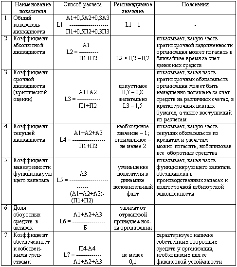 Примечание: А1 = ст. 250 + ст. 260, А2= ст. 230 + ст. 240 + ст. 270, А3 = стр. 210 + стр. 220+ стр. 140, А4 = стр. 190 – с.140., П1 = стр. 620, П2 = стр. 610 + стр. 660, П3 = стр. 590, П4 = стр. 490 + стр. 630 + стр. 640 + стр. 650 Поскольку в 2004 г. А1<П1 и А4>П4 то ликвидность баланса предприятия в этот период можно оценить как неудовлетворительную. В 2005 г. А2>П2 и А4<П4, то есть минимальное условие ликвидности выполняется. Оценим платежеспособность предприятия по следующим коэффициентам: · Общий показатель ликвидности (L1); · Коэффициент абсолютной ликвидности (L2); · Коэффициент срочной ликвидности (L3); · Коэффициент текущей ликвидности (L4); · Коэффициент маневренности функционирующего капитала (L5); · Доля оборотных средств в активах (L6); · Коэффициент собственных оборотных средств (L7). Сведем данные в таблицу 2.5: Таблица 2.5 Показатели платежеспособности предприятия