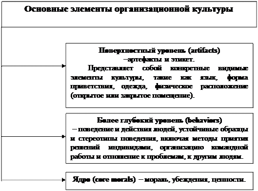 Рисунок 1.1- Основные элементы организационной культуры Каждый из этих уровней формируется, поддерживается, развивается. При этом применяются различные методы развития и совершенствования организационной культуры. Для формирования элементов 1 уровня можно использовать следующие методы: Административные – к ним можно отнести методы прямого, официального указания принципов, стандартов, норм и правил поведения в сочетании с административными санкциями со стороны руководства организации, основанные на отношениях власти и подчинения, например, устав, трудовой распорядок, организация дисциплинарных отношений, информирование. Административные методы отличаются точностью, определенностью, однозначностью и устойчивостью, что позволяет быстро адаптироваться к ним сотрудников, ориентироваться и апеллировать к ним в случае возникновения спорных ситуаций. Административные методы согласуются со стратегией развития организации и кадровой политикой, являются очень эффективными в случае преобладания нормативной регуляции деятельности и применяются в комплексе с системой стимулирования. Критерии отбора кадров, развития и обучения персонала, формирование миссии и стратегии, структура организации, распределение функций и обязанностей можно отнести к административным методам формирования корпоративной культуры.Психологические методы – связанные с использованием групповых процессов для воздействия на личность, входящую в трудовой коллектив, и отдельных, особенно авторитетных работников (групповое давление, влияние), а также психологических способов воздействия на личность и особенностей восприятия и усвоения нужных образцов поведения (заражение, подражание, научение).Давно доказано, что люди лучше всего усваивают новые для себя образцы через подражание. Руководитель должен стать примером, ролевой моделью, показывая пример такого отношения к делу, такого поведения, которое предполагается закрепить и развить у подчинённых. Психологическое воздействие возможно не только с помощью создания психологического давления или заражения. Ознакомление и демонстрация эффективности культурных образцов при «обмене опытом», где можно реально увидеть к чему ведет развитие культуры в определенном направлении, формирует убежденность и снимает ограничения, которые накладывает «своя» организационная культура.Символические методы развития организационной культуры связаны с материальным воплощением основных идей и ценностей в виде символов, лозунгов, логических и смысловых ассоциаций, поведенческих культурных форм, пространственного расположения и т.п.Символические методы направлены на продуцирование и использование культурных форм, назначение которых – зафиксировать и передать культурный опыт эффективного взаимодействия другим поколениям сотрудников. Данные методы отличаются большой эмоциональной насыщенностью, которая привлекает сотрудников к их использованию, высокой скоростью воздействия, концентрируя в себе смысловые и технологические идеи.Именно символические методы позволяют отделить одну общность от другой, придают ей неповторимый колорит. В силу своей эмоциональности человек более охотно поддается воздействию символических методов.Символические методы хороши тем, что в зависимости от того направ