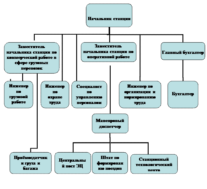 Рисунок 2.1 - Схема организационной структуры управления грузовой Станцией Руководство работой Станции осуществляет начальник станции, который распоряжается средствами станции, подписывает денежные документы. Начальник Станции принимает, перемещает и увольняет работников Станции, издаёт приказы, поощряет и наказывает работников. Начальнику Станции предоставлено право давать распоряжения по обеспечению нормальной работы Станции, работникам других линейных предприятий, выполняющих работу на территории Станции. Начальник Станции несет полную ответственность за выполнение задач, возложенных на него «Положением о железнодорожной станции». Руководство эксплуатационной работой железнодорожной Станции осуществляется заместителем начальника Станции по оперативной работе. Кроме того, он осуществляет руководство оперативной работой Станции. Обеспечивает выполнение задания погрузки. Контролирует выполнение технологического процесса и сменных заданий по развозу вагонов под погрузку, выгрузку, сбор и отправление порожних и груженых вагонов. Организует работу железнодорожной станции и взаимодействие структурных подразделений по выполнению грузовой и поездной работы в соответствии с планом и заданиями отделения железной дороги, обеспечивая безопасность перевозок, сохранность грузов и подвижного состава, минимальные затраты и эффективное использование технических средств. Заместитель начальника станции по коммерческой работе в сфере грузовых перевозок осуществляет руководство грузовой и коммерческой работой станции. Обеспечивает ритмичное выполнение планов погрузки и выгрузки грузов грузоотправителями и грузополучателями. Осуществляет подбор, расстановку и целесообразность использования работников, обеспечивающих грузовую и коммерческую работу Разработку и внедрение технологического процесса работы Станции и передовых методов труда, проведение мероприятий по рациональному использованию технических средств, устройств, обеспечению безопасности движения поездов и техники безопасности, а также анализ работы Станции осуществляют инженер станции и инженер по охране труда. Главный бухгалтер осуществляет организацию бухгалтерского и налогового учета хозяйственно-финансовой деятельности предприятия и контроль над экономным использованием материальных, трудовых и финансовых ресурсов. Обеспечивает организацию учета и отчетности на основе внедрения новой вычислительной техники, разработку и осуществление мероприятий, направленных на соблюдение государственной и финансовой дисциплины. Организует учет поступающих денежных средств, товарно-материальных ценностей и основных средств, результатов хозяйственно-финансовой деятельности предприятия, а также финансовых, расчетных и кредитных операций. Обеспечивает соответствие осуществляемых операций законодательству Российской Федерации, контроль над движением имущества и выполнением обязательств за своевременностью и правильностью оформления документов. Обеспечивает контроль за расчетами по заработной плате с работниками Станции, правильным начислением и перечислением платежей в государственный бюджет, взносов в пенсионный фонд, на государственное социальное страхование. Руководит работниками бухгалтерии предприятия. Инженер по орг