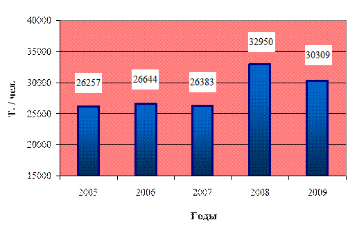 В 2009 году наблюдается экономия эксплуатационных расходов как к плану (на 64 тыс.р.), так и к соответствующему периоду прошлого года (на 60 тыс.р.). В структуре эксплуатационных расходов Станции в 2009 году наибольший удельный вес занимает фонд заработной платы – 74,8 процента, на втором месте отчисления на социальные нужды – 18 процентов, наименьший удельный вес приходится на прочие материальные расходы – 0,1 процента. План по труду содержит такие показатели, как производительность труда, численность работников, фонд оплаты труда и среднемесячная заработная плата. При действующей системе планирования разработка плана по труду производится на основе установленного вышестоящей организацией лимита фонда заработной платы, численности работников по перевозкам и заданного процента роста производительности труда на перевозках. При расчете процента роста производительности исходят из базы, которая принимается по отчету года, предшествующего плановому периоду. Лимит численности работников по перевозкам линейным предприятиям устанавливается отделениями железных дорог. При этом учитываются факторы, снижающие численность работников (введение новых технических средств, ресурсосберегающей технологии, улучшение технологий, улучшение эксплуатационных показателей и др.), и факторы, которые увеличивают потребность в контингенте (вновь вводимые производственные объекты и производственные мощности). Анализ использования труда и заработной платы является важным разделом экономического анализа. Анализ плана по труду позволяет определить, насколько эффективно на предприятии используются трудовые ресурсы, экономно расходуется фонд заработной платы, происходит рост производительности труда и среднемесячной заработной платы. В процессе анализа по станции К-1 рассмотрим динамику численности, производительности труда, фонда заработной платы, обратив внимание на соотношение между темпами роста этих показателей. Динамика показателей плана по труду по перевозкам за 2005 – 2009 годы представлена в Приложении А. По данным отчета в течение рассматриваемого периода наблюдается тенденция снижения численности работников Станции (-1,3 %), связанная с наличием текучести кадров на предприятии. За рассматриваемый период с 2005 по 2009 годы производительность труда увеличилась на 4052 т/чел или на 15,4 %. Увеличение происходило за счет роста объёма работы и снижения численности контингента Станции. Динамика производительности труда по железнодорожной Станции на рисунке 2.2. Рисунок 2.2 – Динамика производительности труда за 2005 – 2009 годы На железнодорожном транспорте создаются благоприятные условия для роста производительности труда в связи с увеличением объёма перевозок, так как при прочих равных условиях возрастает лишь зависящий от размеров движения контингент, а не зависящий остаётся некоторое время почти постоянным. Следовательно, общая численность работников по эксплуатации возрастает значительно медленнее, чем объём перевозок. Основным показателем объёма грузовой работы железнодорожной Станции (объёмом работы) является общая погрузка - выгрузка (переработка грузов) в тоннах. Объём перевозок зависит от следующих факторов: объёма производства продукции промышленности и сельского хозяйства, структуры производимой продукции, размещения прои