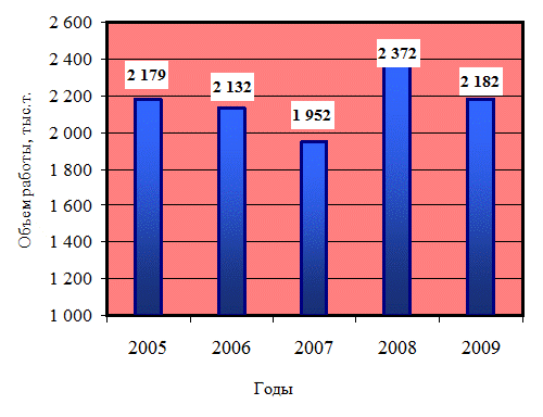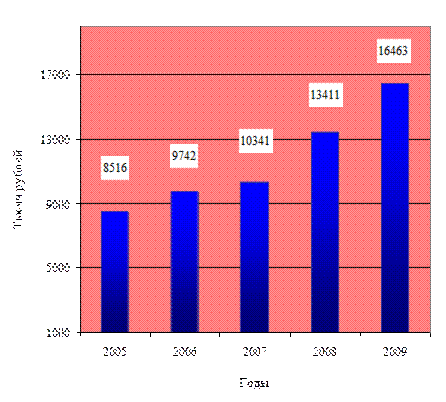 Рисунок 2.3 – Динамика объема работы станции К-1 за 2005-2009 годы По данным таблицы Приложения А в 2005 году объём погрузки, выгрузки составил 2 179 тыс.т. В 2006 году объём работы составил 2132 тыс.т. Снижение, по сравнению с плановым заданием, составило 63 тыс.т или 3 %, а по сравнению с 2005 годом составило 47 тыс.т или 2 %. В 2007 году снижение объём работы составило 194 тыс.т или 9 % к плану и 180 тыс. т. или 8 % к 2006 году. В 2008 году выполнение объёма работы составило 2372 тыс. т, что на 353 тыс. т или на 18 % больше планового задания и на 420 тыс. т или на 22 % выше уровня предыдущего года. В 2009 году произошло снижение объёма переработки грузов на 109 тыс.т или на 5 % к плану и на 190 тыс.т или на 8 % к 2008 году. Основным условием успешной работы предприятия является такая организация оплаты труда, при которой ее размер напрямую влияет на прибыль. Превратить материальную заинтересованность работников в одно из действенных средств повышения эффективности производства возможно при необходимом условии установления непосредственной зависимости размера оплаты труда от его количества и качества, от выполнения тех или иных показателей, которые отражают интересы предприятия. Все денежные выплаты работникам структурного подразделения за их труд образуют фонд оплаты труда (ФОТ). Планирование фонда оплаты труда осуществляется, исходя из лимита численности персонала, занятого на перевозках, и среднемесячной заработной платы с учётом запланированного роста производительности труда. За базу принимается среднемесячная заработная плата отчётного периода и её индексация на процент роста цен на продовольственные товары и услуги в плановом периоде. Из таблицы приложения А видно, что фонд оплаты труда постоянно увеличивается. В 2005 году фонд оплаты труда составил 8516 тыс. р. В 2006 году фонд оплаты труда увеличился по сравнению с плановым заданием на 398 тыс. р. или на 4 % и на 1225 тыс.р. или на 14 % к уровню 2005 года и составил 9742 тыс. р. В 2007 году произошло увеличение фонда оплаты труда на 245 тыс. р. или на 2 % по сравнению с плановым заданием и на 599 тыс. р. или на 6 % и составил 10341 тыс. р. За 2008 год увеличение фонда оплаты труда к плановому заданию составило 842 тыс. р. или 7 %, а к предыдущему году на 3070 тыс. р. или на 30 %. В 2009 году фонд оплаты труда составил 13411 тыс. р. В 2009 году фонд оплаты труда увеличился по сравнению с плановым заданием на 426 тыс. р. или на 3 % и на 3052 тыс.р. или на 23 % к уровню 2008 года и составил 16463 тыс. р. За рассматриваемый период с 2005 по 2009 годы фонд оплаты труда увеличился на 7947 тыс. р. или на 93,3 %. Динамика фонда оплаты труда представлена на рисунке 2.4.