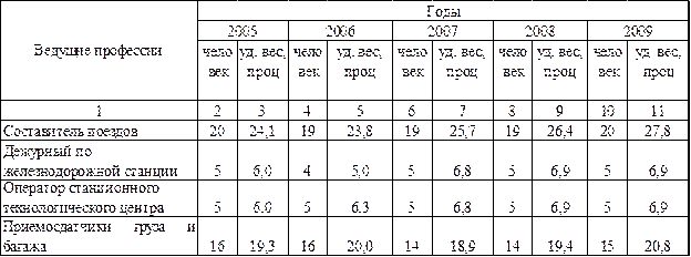Рисунок 2.5 – Динамика численности по перевозкам за 2005 – 2009 годы Таблица в Приложении А иллюстрирует, что среднесписочная численность работников железнодорожной Станции по перевозкам в период с 2005 по 2009 годы постоянно снижалась. В 2005 году численность составляла 83 человека. В 2006 году численность снизилась на 3 человека или на 4 % по сравнению с 2005 годом, к плановому заданию превышение численности составило 3 человека или 4 %. В 2007 году численность составляла 74 человека. По сравнению с плановым заданием она снизилась на 1 человека или на 1 % и в сравнении с 2006 годом на 6 человек или на 7 %. В 2008 году численность составила 72 человека, что соответствовало плановому заданию, а к 2007 году снизилась на 2 человека или на 3 %. В 2009 году среднесписочная численность работников станции содержалась на уровне предыдущего года и планового задания. Снижение численности по перевозкам за рассматриваемый период с 2005 по 2009 годы составило 11 человек или 13,3 %. При анализе численности работников на предприятиях железнодорожного транспорта особое внимание уделяется ведущим профессиям. На Станции ведущими профессиями являются следующие: составитель поездов, дежурный по железнодорожной станции (ДСП), оператор станционного технологического центра обработки информации и поездной документации (СТЦ), приемосдатчик груза и багажа. Структура численности работников по ведущим профессиям представлена в таблице 2.4. Численность работников станции по ведущим профессиям за рассматриваемый период сохранялась примерно на одном уровне. Небольшое изменение числа работников этих профессий связано с изменением объемных показателей работы станции. По таблице 2.4 за рассматриваемый период с 2005 по 2009 годы общая численность на станции снизилась на 13,3 %, в то время как численность по ведущим профессиям сохранилась на прежнем уровне. Таблица 2.4 – Структура численности работников Станции по ведущим профессиям Кроме ведущих профессий ведется учет численности по категориям работников таблице 2.5. Таблица 2.5 - Структура численности железнодорожной Станции по категориям работников за период с 2005 по 2009 годы Как видно из таблицы 2.5 снижение численности по станции за период с 2005 по 2009 год составляет 11 человек или 13,3 %. Снижение численности за рассматриваемый период произошло за счёт естественного оттока работающих (увольнение на пенсию, перевод на другие предприятия, увольнение по собственному желанию). Наряду с изменением общей численности работников можно рассмотреть динамику движения работников Станции в таблице 2.6. Таблица 2.6 – Динамика показателей движения персонала на Станции