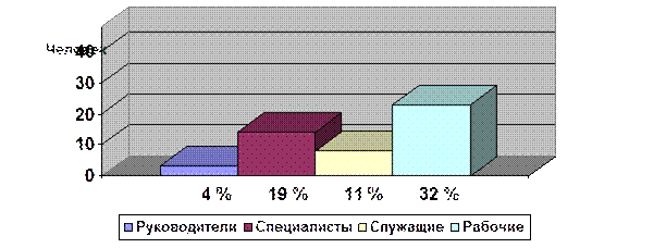 Рисунок 2.8 - Категории опрошенных сотрудников На рисунке 2.9 видим, что наибольший процент опрашиваемых составляют категории рабочих, т.к. от общей численности они составляют 49 %. Для исследования отобраны работники разного возраста (от 20-30 лет 15 % человек, от 30-40 лет 18 % человек, 40-50 лет 33 % человек), все они имеют стаж работы на станции. Предпочтение отдано тем сотрудникам, которые имеют опыт работы от 10 до 30 лет (до 5 лет – 7 % человек, от 5 до 10 лет – 14 % человек, от 10 до 20 лет – 21 % человек и более 20 лет – 25 % человек) и среднее профессиональное образование, т.к. кантингент с данным образованием составляют 67% от общей численности (среднее 18 % человек, среднее профессиональное 33 %, высшее 15 % человек).
