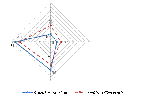По результатам анализа ситуации обнаружены значительные расхождения во мнениях. Единственное общее пожелание касается важнейших характеристик и общего стиля лидерства. Здесь также следует сказать о некоторых особенностях мнений, высказанных работниками. 11% работников согласны с руководителем по вопросу управления работниками и управления наемными работниками. 14% согласны с мнение руководителя при оценке общего стиля лидерства. 6% согласны с мнением руководителя при оценке связующей сущности организации. 15% согласны с руководителем при оценке стратегической цели. 12% согласны с мнение руководителя при оценке критериев успеха. Таким образом, мы видим, что мнение руководителя разделяют от 6 до 15% работников. Но этого слишком мало для того, чтобы можно было говорить о решении проблемы несогласованности мнений работников и руководителя. Особое внимание следует обратить на проблему, которая заключается в разном видении руководителя и работников принципов управления и стратегического направления движения компании. Кроме того, следует особо выделить несогласованные оценки руководителя и работников целей деятельности компании и критериев успеха. Эта несогласованность, на наш взгляд, представляет собой важную проблему, потому что организация не стоит на месте, она постоянно меняется, а для того, чтобы это изменение превратилось в успешное развитие, нужна общая цель, к которой должны стремиться не только руководители, но и работники. Для успешного функционирования организации необходимы единые критерии оценки результатов деятельности, в противном случае возникает ситуация, когда руководители оценивают, например, изменение затрат в сторону снижения как положительный момент в деятельности предприятия, а работники предпочитают стабильность и не заинтересованы что-либо менять. Из сказанного можно сделать вывод, что одна из задач совершенствования организационной культуры на данном предприятии должна заключаться именно в выработке общих для всех целей и критериев оценки результатов деятельности предприятия. В целом сравнение оценки нынешнего состояния организационной культуры и того, что хотелось бы видеть руководителю и работникам данной организации, то можно сделать следующий вывод: резких изменений не желает никто. В соответствии с полученными данными представим профиль организационной культуры станции Карбышево-1 по итогам опроса руководителя станции на рисунке 2.10.