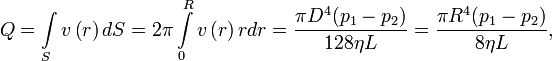 Q — объёмная скорость потока; A — площадь сечения трубы. Число Рейнольдса как критерий перехода от ламинарного к турбулентному режиму течения и обратно относительно хорошо действует для напорных потоков. При переходе к безнапорным потокам переходная зона между ламинарным и турбулентным режимами возрастает, и использование числа Рейнольдса как критерия не всегда правомерно. Например, в водохранилищах формально вычисленные значения числа Рейнольдса очень велики, хотя там наблюдается ламинарное течение. 2.4 Уравнение или закон Пуазейля - закон, определяющий расход жидкости при установившемся течении вязкой несжимаемой жидкости в тонкой цилиндрической трубе круглого сечения. Согласно закону, секундный объёмный расход жидкости пропорционален перепаду давления на единицу длины трубки (градиенту давления в трубе) и четвёртой степени радиуса (диаметра) трубы: