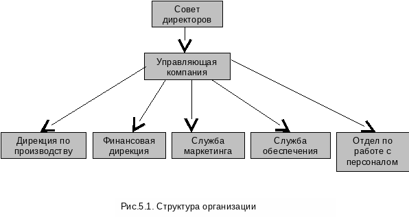 Альтернативой представленному организационному плану может служить привлечение кредитных ресурсов по ставке до 12% годовых, необходимых для финансирования оснащения построенного здания. Юридические аспекты организации и функционирования возведенного объекта определяются действующим законодательством Российской Федерации. 5.2.Структура управления Цель данного раздела – разработка системы управления компанией, направленной на максимально эффективное достижение поставленных задач. Сформулируем требования к системе управления: адекватность назначения и функций управляющих структур целям и стратегии фирмы; восприимчивость к изменениям внешних условий и способность к быстрой трансформации управляющих структур для решения возникающих проблем; способность к переработке и точному распространению интенсивных потоков информации; жесткий контроль над исполнением управленческих решений и организации системы отслеживания результатов данных решений; соблюдение принципа делегирования полномочий, при которой каждый сотрудник в своей четко определенной сфере компетенции имеет право принимать самостоятельные решения и нести за них полную ответственность; соответствие квалификации руководителей и сотрудников кругу их функциональных обязанностей; разработка и реализация на постоянной основе программы обучения и повышения квалификации работников с целями и задачами фирмы.