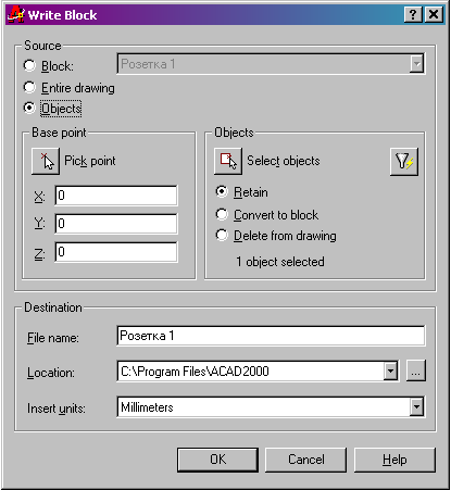 Розетка 1 вже визначена. Чи бажаєте ви її перевизначити? 5. Зробіть клік на кнопці Так . Всі екземпляри блоку створені на робочому кресленні будуть автоматично модифіковані. Збереження блоків як файлів У версіях, що передують AutoCAD 2000 , блок, використовуваний в іншому кресленні, повинен був бути оформленим у виді окремого файлу креслення. Тепер же за допомогою AutoCAD DesignCenter можна безпосередньо вставляти в креслення блоки з іншого креслення. Але багато користувачів воліють все-таки організовувати окремі файли типових блоків, цілком резонно думаючи, що з такими файлами працювати легше, ніж розшукувати компоненти в інших, часом досить об'ємних кресленнях. У такий спосіб організуються бібліотеки типових деталей чи символів, що можуть використовувати в міру необхідності всі співробітники деякого підрозділу чи конструкторського бюро. Щоб зберегти блок як файл, виконаєте ряд операцій. 1. Введіть в командному рядку команду wblock - . (Команда WBLOCK (ПБЛОК) призначена для запису блоку. "Запис у файл" — те ж, що і "збереження у файлі").