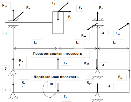 Полученный результат округляем по ГОСТ 6636 – 69 до ближайшего большего значения из ряда R40[5,с.161]. Принимаем dв2 =…мм. 3.2 Основные нагрузки, действующие на валы, возникают в зубчатом зацеплении: Fa=...H; Fr=...H; Ft=...H. Собственный вес вала и насаженных на нем деталей не учитываем, поскольку они играют роль лишь в весьма мощных передачах, где сила тяжести деталей выражаются величиной того же порядка, что и силы в зацеплении. Силы трения в опорах не учитываются. Большинство муфт, вследствие неизбежной несоосности соединяемых валов, нагружают вал дополнительной силой Fм. При расчёте валов можно приблизительно считать
