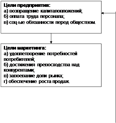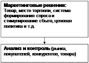 Рис. 1. Схема маркетинговой деятельности предприятия. 2. Анализ потребителей, как реальных, так и потенциальных. Данный анализ заключается в исследовании демографических, экономических, социальных, географических и иных характеристик людей, принимающих решение о покупке, а также их потребностей в широком смысле этого понятия и процессов приобретения ими как нашего, так и конкурирующих товаров; 3. Изучение существующих и планирование будущих товаров, то есть разработка концепций создания новых товаров и/или модернизации старых, включая их ассортимент и параметрические ряды, упаковку и т. д. Устаревшие, не дающие расчетной прибыли товары снимаются с производства и рынка. 4. Планирование товародвижения и сбыта, включая создание, при необходимости, соответствующих собственных сбытовых сетей со складами и магазинами и/или агентских сетей; 5. Обеспечение формирования спроса и стимулирование сбыта (ФОССТИС) путем комбинации рекламы, личной продажи, некоммерческих престижных мероприятий и разного рода материальных стимулов, направленных на покупателей, агентов и конкретных продавцов; 6. Обеспечение ценовой политики, заключающейся в планировании систем и уровней цен на поставляемые товары, определении “технологии” использования цен, кредитов, скидок и т. п. 7. Удовлетворение технических и социальных норм региона, в котором сбывается продукция, что означает обязанность обеспечить должную безопасность использования товара и защиты окружающей среды. 8. Управление маркетинговой деятельностью (маркетингом) как системой, то есть планирование, выполнение и контроль маркетинговой программы и индивидуальных обязанностей каждого участника работы предприятия, оценка рисков и прибылей, эффективности маркетинговых решений. 1.2. Цели и функции маркетинга. Вероятное и уже происходящее регулирование маркетинга во всемирном масштабе наводит на самый существенный вопрос: какова же истинная цель системы маркетинга? Предлагается четыре альтернативных варианта ответа: Достижение максимально возможного высокого потребления; достижение максимальной потребительской удовлетворенности; представление максимально широкого выбора; максимальное повышение качества жизни. Достижение максимально возможного высокого потребления. Многие руководители делового мира считают, что цель маркетинга - облегчать и стимулировать максимально высокое потребление, которое в свою очередь создает условия для максимального роста производства, занятости и богатства. За всем этим кроется утверждение, что, чем больше люди покупают и потребляют, тем счастливее они становятся. "Чем больше - тем лучше" - так звучит этот боевой клич. Однако некоторые сомневаются в том, что возросшая масса материальных благ несет с собой и больше счастья. Их кредо: "Чем меньше - тем больше" и "немного - это здорово". Достижение максимальной потребительской удовлетворенности. Согласно этой точке зрения, цель системы маркетинга - достижение максимальной потребительской удовлетворенности, а не максимально возможного уровня потребления. Потребление большого количества жевательной резинки или владение более обширным гардеробом что-то значит только в том случае, если ведет в конечном итоге к более полной потребительской удовлетворенности. Выявление потребностей – одна из ключевых цел