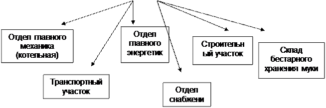 Рис. 5. Производственная структура предприятия Маркетинговый отдел отвечает за обеспечение рекламы продукции дистрибьюторов ООО «Хлебозавод Болдинский», за продвижение этой продукции на рынке. Руководит маркетинговым отделом коммерческий директор. Бухгалтерия выступает одним из структурных подразделений предприятия, возглавляется она главным бухгалтером. Ответственность за организацию бухгалтерского учета несет руководитель предприятия, он же назначает и освобождает от должности главного бухгалтера, несет ответственность за соблюдением методологических основ при ведение бухгалтерского учета. Главный бухгалтер обеспечивает контроль и своевременное отражение на счетах бухгалтерского учета хозяйственных операций, формирует оперативную информацию и бухгалтерскую отчетность для ее предоставления в установленные адреса и сроки. В структуре хлебозавод имеет два фирменных магазина, более 27 торговых киосков. В настоящее время мощность хлебозавода по хлебу в условном ассортименте составляет 120 шт. в сутки, в планируемом ассортименте 64 тн. в сутки; фактически производственная мощность используется на 30% и составляет 30, 32 тн. хлебобулочных изделий в сутки. 2.3. Анализ основных технико-экономических показателей Анализ основных технико-экономических показателей работы предприятия рассчитан и приведен в табл. 1. Таблица 1