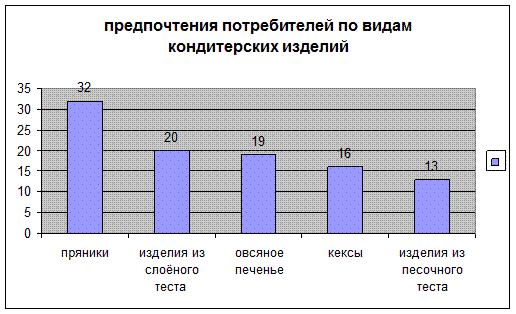 Рис.7. Предпочтения покупателей по видам х/б изделий (%) Динамика изменения потребления хлебной продукции подтверждает рост популярности подового, батонов, формового белого хлеба, а также незначительный (+3%) прирост потребления диетического зернового хлеба (видимо, ввиду увеличения количества людей с заболеваниями желудочно-кишечного тракта и эндокринной системы). На 4% меньше стали употреблять сдобы вследствие более высоких цен на такие изделия и на 5% меньше стали покупать белого формового хлеба. Что касается кондитерских изделий, наибольшим предпочтением пользуются (рис.8): пряники -32%; изделия из слоёного теста – 20%; овсяное печенье- 19%; бисквиты, рулеты, кексы – 16%; изделия из песочного теста- 13%.