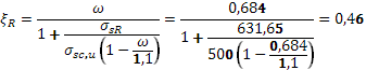 где: ssc ,u ¾ предельное напряжение в арматуре сжатой зоны, принимаемое для конструкций из тяжелого, мелкозернистого и легкого бетонов по СНиП 2.03.01-84 равным 500 МПа; ssR —напряжение в арматуре, МПа, принимаемое для арматуры класса А-V равным: ssR = Rs + 400 – ssp – Dssp =680+400 – 448,35=631,65 МПа; (предварительное напряжение принято с учётом полных потерь ssp =0,7∙640,5=448,35 МПа); где: Поскольку класс арматуры А-V, кроме этого выполняется условие ξ=0,11 < ξR =0,46 то расчетное сопротивление арматуры Rs умножается на коэффициент определяемый по формуле: