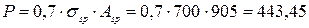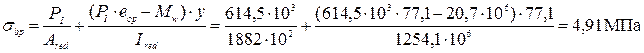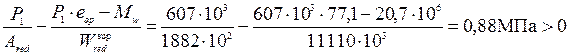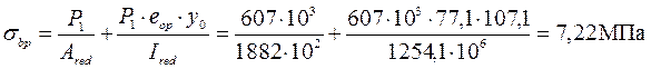 Первые потери σlos 1 = σ1 + σ6 = 21+8,5= 29,5 МПа, тогда усилие обжатия с учетом первых потерь будет равно: P1 =(ssp – σlos 1 )∙Asp = (700 – 29,5)∙905 = 607 ∙103 Н = 607 кН. Определяю максимальное сжимающее напряжение в бетоне от действия силы P1 без собственного веса, принимая у=у0 =107,1 мм.