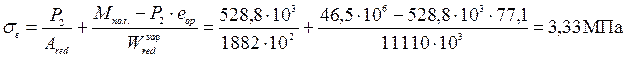 Так как при действии усилия обжатия P1 в стадии изготовления минимальное напряжение в бетоне (в верхней зоне), равное