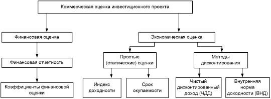 Рис. 2 Классификация инвестиций в зависимости от ряда признаков Множество разнообразных инвестиционных проектов, реализуемых на практике, может быть классифицировано в зависимости от различных признаков. С точки зрения общего подхода к классификации инвестиционных проектов можно выделить следующие признаки [22, C47]: - тип проекта — в зависимости от сферы деятельности, в которой осуществляется реализация проекта (организационная, технологическая, экономическая, социальная, смешанная); - масштаб проекта — монопроект, мультипроект, мегапроект (монопроект — проект различного типа и вида, мультипроект — комплексный проект, состоящий из ряда монопроектов, мегапроект — программа развития регионов, отраслей, включающий в свой состав ряд моно- и мультипроектов); - вид проекта — по характеру предметной области проекта (инновационные, учебно-образовательные, смешанные и др.); - длительность проекта — по продолжительности периода реализации цикла проекта (краткосрочные — до 1 года, среднесрочные — 1—3 года, долгосрочные — свыше 3 лет). 1.3 Особенности оценки инвестиционного проекта Смысл общей оценки инвестиционного проекта заключается в предоставлении всей информации о последнем в виде, позволяющем лицу, принимающему решение, сделать заключение о целесообразности осуществления инвестиций. В этом контексте особую роль играет коммерческая оценка. Оценка коммерческой состоятельности – заключительное звено предпроектных исследований. Она должна основываться на информации, полученной и проанализированной на всех предшествующих этапах работы. Коммерческая оценка олицетворяет собой интегральный подход к анализу инвестиционного проекта. Как следствие, информация именно этого раздела бизнес-плана является ключевой при принятии потенциальным инвестором решения об участии в проекте. Ценность результатов, полученных на данной стадии предпроектных исследований, в равной степени зависит от полноты и достоверности исходных данных и от корректности методов, использованных при их анализе. Значительную роль в обеспечении адекватной интерпретации результатов расчетов играет также опыт и квалификация экспертов или консультантов. Очевидной представляется необходимость применения стандартизированных методов оценки инвестиций. Это, во-первых, позволит уменьшить влияние уровня компетентности экспертов на качество анализа, а во-вторых, обеспечит сопоставимость показателей финансовой состоятельности и эффективности для различных проектов. Существует два общих критерия коммерческой привлекательности инвестиционного проекта: финансовая состоятельность (финансовая оценка) и эффективность инвестиций (экономическая оценка). Оба критерия взаимодополняют друг друга. В первом случае анализируется ликвидность проекта в ходе его реализации. Во втором – акцент ставится на потенциальной способности проекта сохранить покупательную ценность вложенных средств и обеспечить достаточный темп их прироста. Методы оценки коммерческой состоятельности проекта представлены на рис.3.