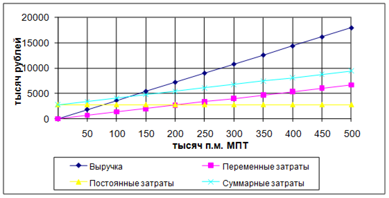 Рис. 9 Точка безубыточности при производстве металлополимерных труб Определим количество единиц продукции, разделив величину постоянных затрат на удельную маржинальную прибыль [47, C214]: