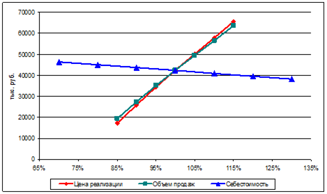 Рис. 11 Чувствительность NPV проекта к колебаниям цены реализации, объема продаж и себестоимости Как видно из рис. 11 наиболее сильное влияние на эффективность проекта оказывает уровень цены на производимую продукцию и объем продаж. При увеличении цены на продукцию на 10% чистый дисконтированный доход проекта составит 57873 тыс. руб., что на 36% больше NPV, формируемого при базовой цене. А десятипроцентное снижение цены, снижает NPV проекта до 25931 тыс. руб., т.е. на 39%. Десятипроцентное снижение уровня объема продаж уменьшает NPV проекта до 27468 тыс. руб. При увеличении уровня объема продаж на 10% от проектного уровня NPV проекта составит 56519 тыс. руб. Несмотря на то, что цена реализации и объем продаж оказывают большое влияние на NPV, вероятность их колебания может быть очень низкой, следовательно, изменения этих факторов будут представлять незначительный риск. ГЛАВА 3. ОЦЕНКА ЭФФЕКТИВНОСТИ ИНВЕСТИЦИОННОГО ПРОЕКТА