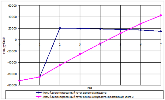 Рис. 12 График коэффициентов финансовой оценки 3.2 Экономическая оценка инвестиционного проекта Целью экономической оценки инвестиционного проекта является определение целесообразности осуществления инвестиций (долгосрочных финансовых вложений с целью получения выгоды в будущем) [10, C39]. Рассматриваемый вариант реализации проекта характеризуется следующими основными показателями. Срок окупаемости вложений составляет 4 года. Это означает, что приведенный по фактору времени суммарный экономический эффект (чистый денежный поток нарастающим итогом) становится положительным на пятый год после начала вложений. При расчете дисконтированного срока окупаемости получаем – 5 лет. Чистый дисконтированный денежный поток нарастающим итогом, характеризующий величину экономического эффекта за расчетный период, составляет 42 321,56 тыс. руб. Внутренняя норма доходности проекта составляет 35,12, что свидетельствует о достаточной устойчивости проекта. Индекс доходности проекта составляет 1,65. Это означает, что за расчетный период экономический эффект от реализации проекта в 1,65 раза превышает связанные с проектом затраты. Сведем основные показатели экономической оценки в табл. 15. Таблица 15 Показатели экономической оценки инвестиционного проекта
