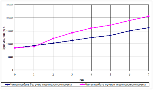Рис. 15 Чистая прибыль Слабые стороны проекта – большие капитальные вложения, которые окупятся (с учетом ставки дисконтирования) через 5 лет, а также длительный срок подготовки реализации проекта (в самые сжатые сроки – не менее 1,5 года). Но это даст предприятию частичную независимость от заводов-изготовителей, позволит управлять затратами, даст возможность расширять ассортимент продукции, производить новые виды товара, а, следовательно, занимать новые ниши рынка по металлополимерным изделиям и запчастям по ремонту железных дорог. ЗАКЛЮЧЕНИЕ В данной дипломной работе приведён реальный пример расчёта эффективности капитальных вложений, используемый в практике работы предприятия. Первая глава носит теоретический характер, в ней даны основные понятия инвестиций, инвестиционного проекта, их классификация, описаны основные методы расчета эффективности инвестиционного проекта. Во второй главе дана характеристика предприятия ООО «Оптимум», наглядное представление товара, который планируется производить на данном участке. В существующих условиях внешнего окружения (зависимость от заводов-производителей, ужесточение контроля над деятельностью коммерческих организаций ревизорскими службами МПС, повышение влияния со стороны конкурентов и др.) фирма ООО «Оптимум» оказывается в положении, когда необходимо принимать инвестиционные решения. Для их осуществления и предлагается данный проект. Зависимость от одной номенклатурной группы приводит к негибкости работы предприятия. Организация будет иметь возможность манипулировать изменениями на том или ином рынке, если их будет несколько (в данном случае это рынок МПТ). Финансово-экономические показатели выявляют положительную тенденцию роста предприятия. При расчете показателей ликвидности приходим к выводу о наличии абсолютно ликвидного баланса. Основной проблемой, выявленной при расчете ликвидности финансовых показателей – дефицит денежных средств. Для реализации инвестиционных проектов необходимо привлечение дополнительных средств в виде займа у кредитных организаций. Показатели деловой активности выявили, что финансовый цикл на предприятии в среднем имеет продолжительность 27,6 дней. Это означает, что вложенные средства в товар и материалы возвратятся в виде платежей покупателей примерно через месяц. Эта проблема связана с большой дебиторской задолженностью и большими запасами на предприятии, а также отсутствием более надежных долгосрочных обязательств. Предприятие оборачивает свои активы для производства и реализации продукции 3,72 раза в год. Чем больше значение этого показателя, тем лучше предприятие использует свои активы. Показатели финансовой устойчивости показали, что в ближайшее время потеря платежеспособности предприятию не грозит. Показатели прибыльности показали неплохой процент чистой прибыли от выручки. Но для повышения прибыли и стабильности работы нужно вложить деньги в собственное производство, что в будущем приведет к понижению себестоимости за счет увеличения объема продаж. В третьей главе проведена оценка эффективности инвестиционного проекта по созданию производственного участка ООО «Оптимум». Финансовая и экономическая эффективность инвестиционного проекта показали, что проект прибыльный, практически все показатели имею