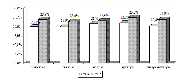Доходы федерального бюджета в 2005 году, включая безвозмездные перечисления, составили 5 121,0 млрд. рублей, что составляет 23,9 % к объему ВВП и 102,8 % к уточненной росписи поступлений доходов в федеральный бюджет на 2005 год. На рис. 1 представлена динамика поступлений доходов в федеральный бюджет за январь-декабрь 2004 и 2005 гг. в % к ВВП. В таблице 4 представлены данные о поступлении доходов в федеральный бюджет в январе-декабре 2005 года в сравнении с тем же периодом 2004 года.